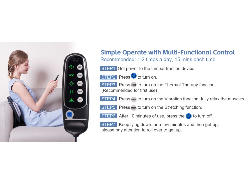 Inteligentní ovladač: Procházejte svou bederní wellness cestu bez námahy pomocí našeho pokročilého ovladače. Tento pokročilý rozbočovač vám umožňuje bez námahy spravovat a přizpůsobovat funkce vašeho zařízení a zajišťuje bezproblémové a intuitivní uživatelské prostředí.
