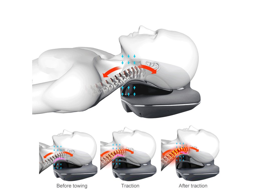 Tento masážní přístroj na krk využívá sílu dynamické trakce k vytvoření nahromadění mezi vaší hlavou a krkem. S pomocí technologie push and pull, elektronické pulzní terapie a výkonné tepelné terapie uvolňuje natahovač krku tlak mezi vašimi ploténkami . Protahuje 21 svalů, které obklopují váš krk, zlepšuje krevní oběh a je navržen tak, aby obnovil přirozené zakřivení krku . Elektronický trakční masážní přístroj krční páteře pracuje se čtyřmi funkcemi;