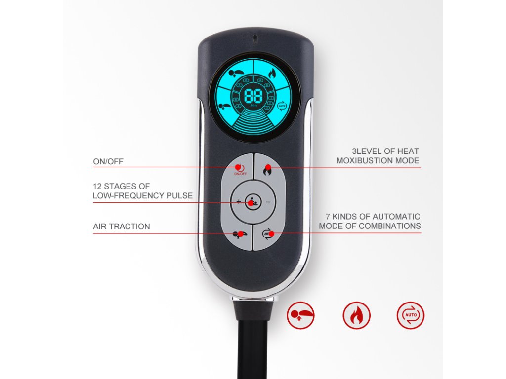 Vzduchová pumpa je umístěna uvnitř ovladače, daleko od uživatele, snižuje hluk a vytváří pohodlnější prostředí, abyste si mohli vychutnat požitek z masáže tiše. Automatické vypnutí po 15 minutách zajišťuje vaši bezpečnost, když usnete.
