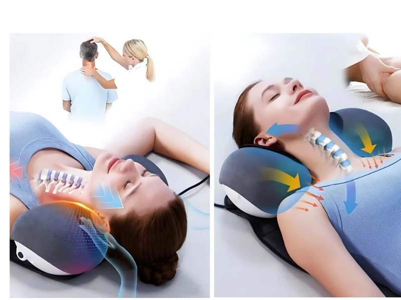 Spodní vzduchová komora se nafukuje/vyfukuje, aby jemně zvedla hlavu a vytvořila kontrolovaný trakční efekt, který otevírá stlačené klouby a podporuje zdravé zakřivení krční páteře.